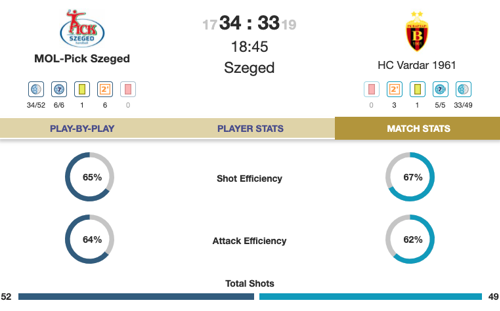 Veszprém started well but the visitors have never let up, and it's a high-scoring 17:17 at the break. Gasper Marguc leads the scoring with six goals, while Gennadiy Komok has had the better day in goal with six saves to five for Rodrigo Corrales.