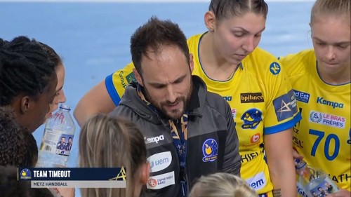 Metz take a time-out with only a few seconds left in the half, leading by 7. Whatever coach Emmanuel Mayonnade said, it worked, as they quickly score another two to end the half.