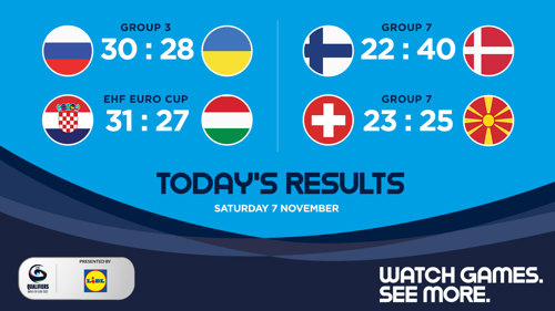 - RESULTS SATURDAY: Russia vs Ukraine 30:28, Finland vs Denmark 22:40, Switzerland vs North Macedonia 23:25