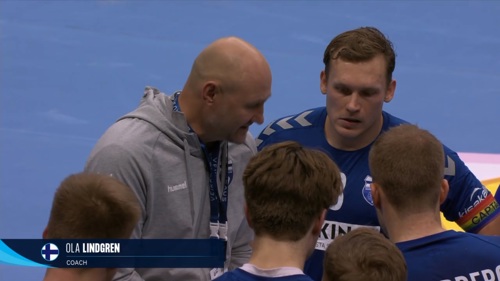 In a team timeout, Finland coach Ola Lindgren urges his men to be a bit more robust against the free-flowing Denmark, who are already up by eight goals within the first 20 minutes.